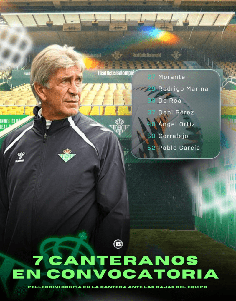 Manuel Pellegrini ha incluido en la lista a siete jugadores del filial, una cifra poco habitual. Ángel Ortiz y Pablo García, ya integrados en la dinámica del primer equipo, no solo apuntan a estar disponibles, sino que incluso podrían partir como titulares, dadas las circunstancias actuales de la plantilla.